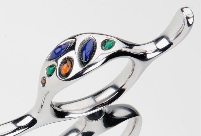 This Debut beauty shear features beautiful amber, blue and green gems on the finger hole. This beauty shear looks like the stylists is wearing a ring while cutting with it. The stylist can choose an amber, green or blue tension dial to accentuate their favorite color gem from the finger ring. The shear has a bent thumb on its offset handle for a comfortable grip.