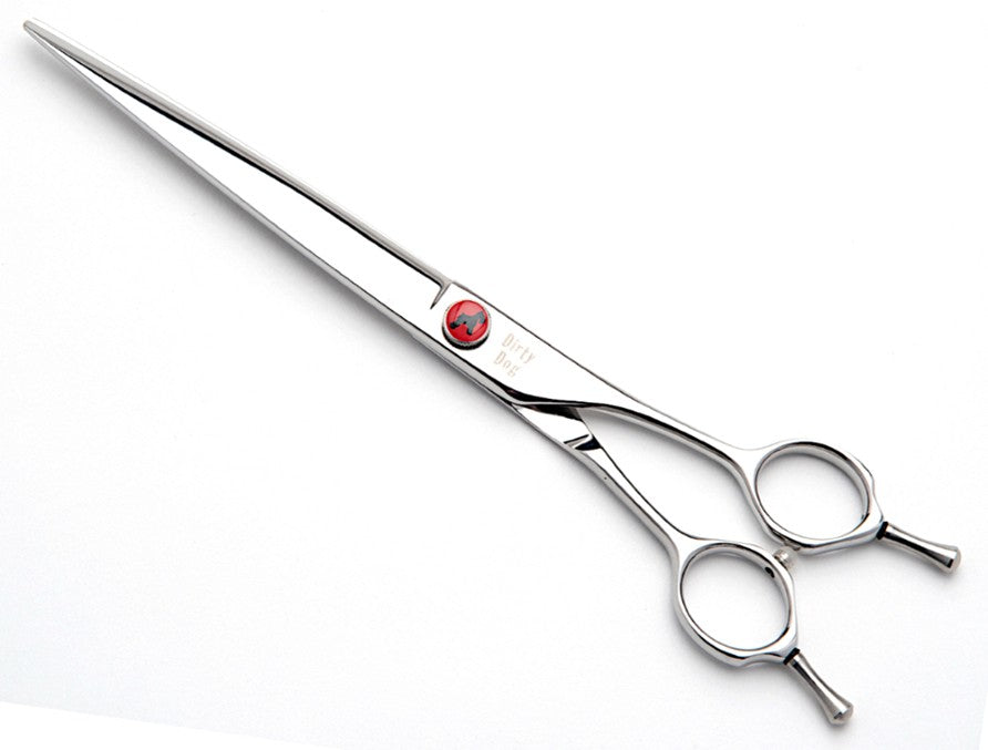These flipper Dirty Dog straight grooming shears are designed to perform well even when the shear is "flipped." The convex edge performs a superior cut every time. The shear comes with a silver tension dial, but is also available with a red Scottish Terrier tension dial design which allows the groomer to display their love for their job as well as the clients they serve.