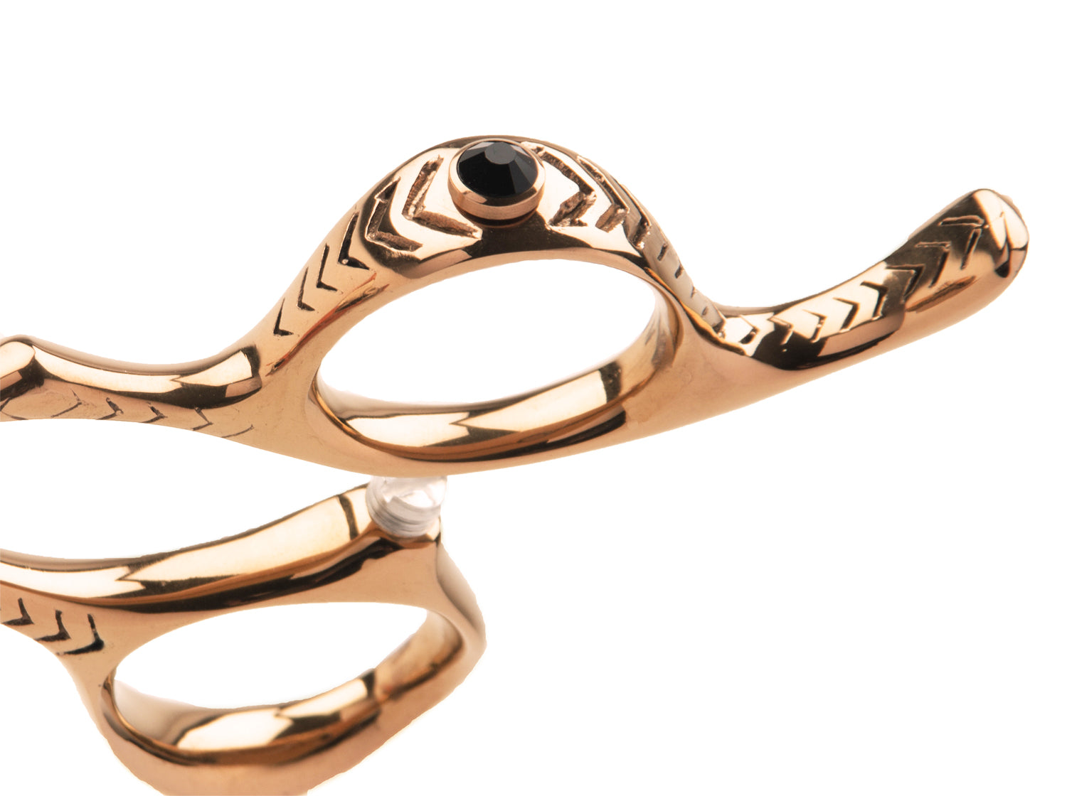 The Dynasty Deco thinner stands out with its gold bronze titanium coating with engraved chevrons, black crystal tension dial, and black crystal on the finger hole. This smooth cutting thinning shear has 30 teeth and a comfortable offset handle with a a slightly bent thumb and is hand forged from Hitachi Japanese 440C steel - an an excellent quality choice for the price! Also available as a true left hand thinner.