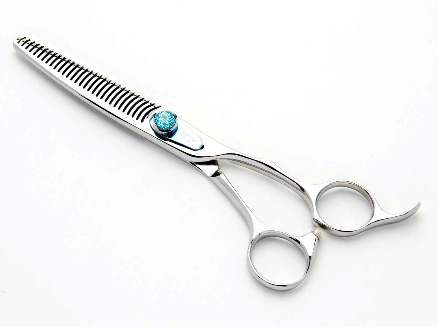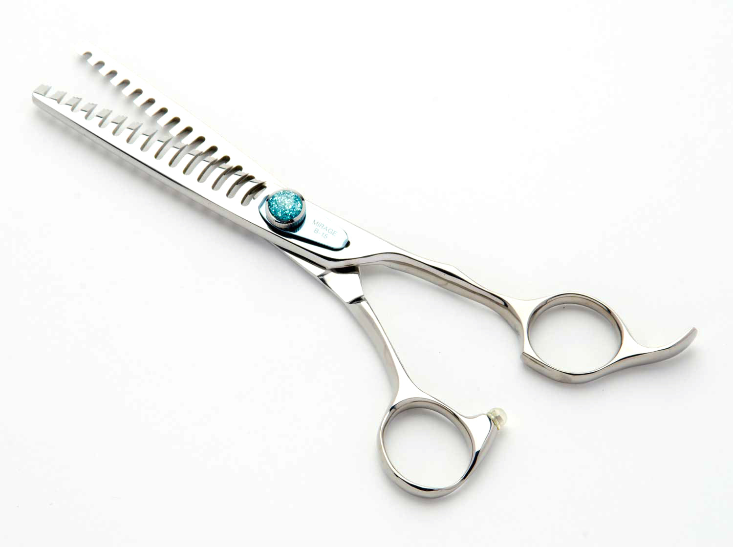 The Mirage B blending thinning shears have teeth on both blades. This unique design leaves no perceptible line in the hair as most thinners do, which saves the extra steps and time involved in blending the cut from the thinners. One cut is all you need. The Mirage B Thinner comes as a 15 teeth thinner, a 30 teeth thinner, and a 40 teeth thinner. The Mirage B Thinners are also ergonomically designed for your comfort.